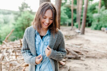 Sample shown is knit in colourway Granit. Melinda wears a size 1 with 2.5 cm / 1” of positive ease at the bust.