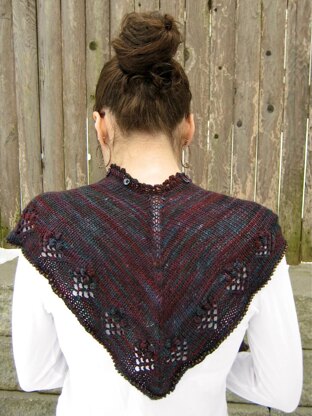 Blackberry Blossom is a cross between a shawlette, a scarf, and a cowl. It has the pointed back traditional to a shawlette, but it is not a fully closed triangle. Two “arms” extend to allow you to tie the scarf in a knot (see page 3). Small buttons are sewn down entire length of inner edges to allow y