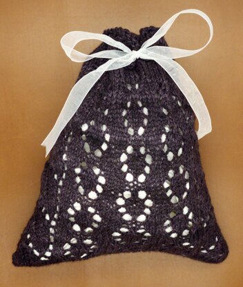The sound of running water; the scent of green growing things; the taste of the blackberry you just picked from the bush. Lacy leaves frame an abundance of delicious blackberries in this bag. Choose a yarn with good stitch definition to make the lace stand out.