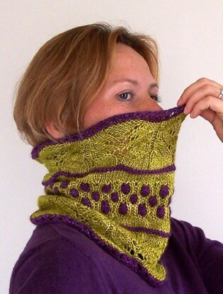 Airy, light and delicate, this cowl gives just the right amount of coverage on windy Summer evenings or mild Winter days and will collapse and scrunch down into a soft collar when worn under a jacket. Worked in the round from the bottom up, with only 11 rounds requiring the use of both colors at the same time.