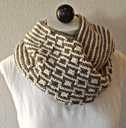 The Blanco infinity cowl combines mosaic knitting with cushy garter stitch stripes. For mosaic knitting in the round, rounds are worked in pairs, two rounds using the same color. The first round work as indicated in the pattern. On the second round, using the same color, you purl the same sts you knit in the previous round, and slip the same sts you slipped. Choose two colors of yarn with lots of contrast for best results.