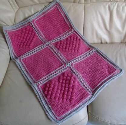This pattern is for a sweet little baby blanket which can be worked in colours to suit a boy or a girl.