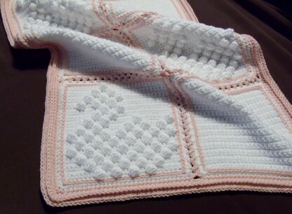 This pattern is for a sweet little baby blanket which can be worked in colours to suit a boy or a girl.