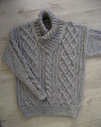 Named after a mountain found in the Cumbrian Lake District of North West England, this sweater has a bold trellis stitch pattern interspersed with single twisted ribs and a simple but effective cable. The centre cable leads up towards the neck division and splits at the neck to frame the collar. The cross-over inset collar not only looks great but is wonderfully warm too. This design is suitable for women as well by simply reversing the joining of the collar to the neck edge at the front.