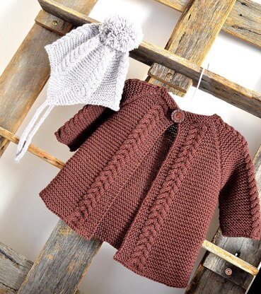 Coat - worked from the top down This stylish coat is worked in garter stitch with a simple cable pattern running down both fronts and down the middle of the sleeves, giving the knitter enough variation no to get too bored. Coat and hat would make the perfect warm and cozy cover-up for brisk spring or autumn days. Makes a great pop over coat and the style would be suitable for either girl or boy, depending on your colour choice. Please Note: Pattern comes with schematic and no seaming is required.