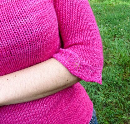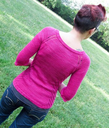 Blind Date is a fitted pullover mostly worked in the round from the top down, with narrow elbow sleeves. The pullover features an easy lace motif on the sides, dramatic waist shaping and lace ruffles for the sleeve edging. Knit it in a bold colour for an eye-catching result!
