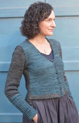 This fun cardigan looks like it has been pieced together, but it is worked from the top down in one piece. The set-in sleeves are picked up at the armholes and worked top down and in the round. The front bands and neck edges are picked up and worked at the end.