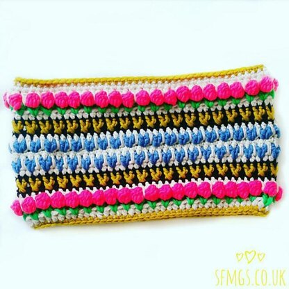 Crochet pattern to make this 'Bloom Bunny' scandi-style, quirky and kitsch, tulip and heart motif cosy crocheted cowl using a variety of fun textured crochet stitches!