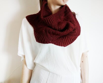 The cowl is worked in the round starting at the bottom and becomes narrower at the top through gentle decreases. Both ends of the cowl feature twisted rib, and the body of the cowl is a lacey pattern that evokes leaves on a stem, growing and unfolding. Knit it up in a luxurious, drapey yarn or a soft, rustic wool, and it will compliment your wardrobe and keep you warm even on the chilliest of days.