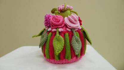 I wanted the flowers on this hat to look like they were coming out of one of those beautiful hat boxes you get from fancy flower shops, To make it extra special I have added a lovely little watering can and a row of pink bobbles around the edge of the crown. The pleats are created by adding extra stitches and then pulling the carrying yarn very tightly behind the stitches being knitted. This is similar to the way old- fashioned tea cosies were created and creates an excellent effect. This hat does take a little patience to finish but it is well worth the effort as it looks truly spectacular.