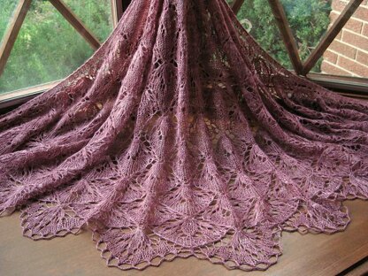 Inspired by the peonies and lilies blooming in and around our southern township of Troy, South Carolina, the main stitch pattern is a version of the Blossom Stitch found in many Estonian lace patterns and is expanded and modified for presentation in this pattern. The shawl can be started with either Five or Seven leaves with instructions provided for both styles. Beginning with a provisional cast on, five or seven leaves are produced in this neck down pattern which lead into blooms that cascade and surround the shoulders and back. Increases at each side of this shawl produce a shallow yet elongated style in a semi-circular shape with a slight flare at the wingtips, scallop edging, somewhat crescent shaping and finished with a chain crochet bind off. Once blocked, the lace is pronounced and drapes well to produce a light and delicate shawl. Approximately 575 yards of lace weight yarn is needed for the Five Leaves style as written and is not intended for enlargement. 675 yards is needed