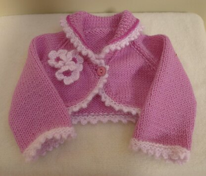 This sweet little bolero style cardigan would look very pretty over the top of a Summer dress . It has raglan sleeves and shaped front. The collar, sleeves and lower borders are all edged with a pretty lace border in a luxurious Angora yarn. The same Angora is used in the little posy of flowers on the right front. A single flower sits just under the collar on the back. This is definitely a special occasion cardigan. Just perfect for a party.