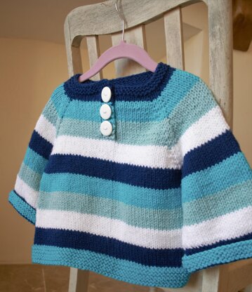 This loose fitting tunic is knitted in a combination of bold blues and white, lovely bright colours that little ones will love. Knitted up using aran yarn to keep toddlers warm and snug on those colder days. Knitted seamlessly from the top down, this raglan sweater has colour changes every 8 rows but the pattern can be easily adjusted if needed. The stripes can be knitted wider or narrower, with several colours or just two, without affecting the pattern.