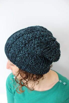 Alternating lace and rib cables play off the ribbing at brim and create long lines that end in a detailed crown on this one. And there's one little surprise in the repeat - a double cable to be worn as a side detail. I do love those little side details...