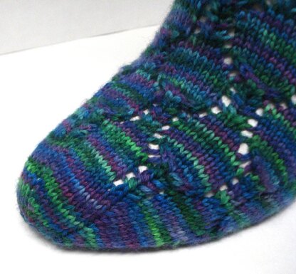 This fun pattern looks like cocktail glasses and makes the most of tonal hand-painted yarns. Knit up in Sugarbee Studios Politically Incorrect Superwash Merino/Nylon Sock in the K’mon-I-Wanna-Leia Colorway this fun pattern works up quickly and makes nice squishy socks with just the right amount of lace.