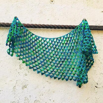 Blue Holly is an asymmetric shawl, worked sideways, in a geometric, triangular stitch. The stitch creates a delicate, lacy fabric with amazing drape which works up really quickly.