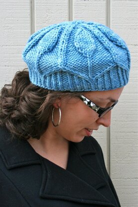 Blue Ice is worked from the bottom up to the crown. Knit stitches are twisted during the lower portion of the hat to give definition and make the design pop off the background. Large petals grow from the ribbing and stretch toward the center of the crown.