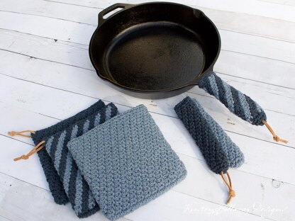 Crochet a cast iron handle cover and hot pad/potholder set for the dad that loves to cook! This easy, beginner-friendly pattern is quick to make and each piece uses only a small amount of yarn. If you want to make the entire set, you'll need two balls of the "super Size" Lily Sugar'n Cream in each color.