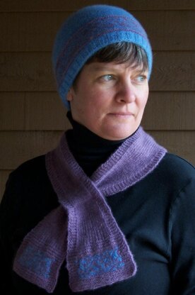 This cozy hat is so light and soft, you forget you're wearing it! The colorwork snowflakes in purple heather accent well with the faded light blue. These colors are reversed in the scarf/ascot which self ties to wrap you neck and chest in the warmth of cashmere.