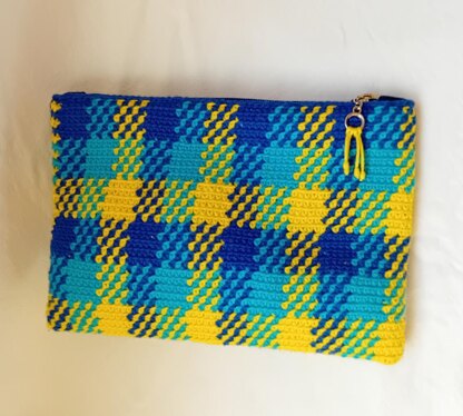 The gauge for this pouch is: 32 stitches and 23 rounds per 10x10 cm (4x4 inches) worked in the stitches of the pattern (tapestry crochet modified single crochet in the round). If your gauge will be different, the finished size of your pouch will be different than this one.
