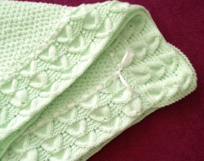 Having been asked many times if my original pattern Bluebell baby blanket in double knit yarn can be knitted in a thicker yarn I decided to re write the pattern. This version has added eyelets for ribbon and is knitted using Aran weight yarn for Autumn/Fall/Winter babies who need a blanket that is a little bit warmer