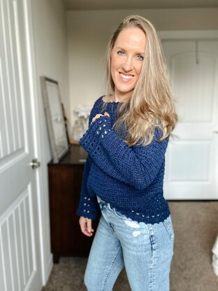 The Bluebell Pullover is inspired by living in Southeast Texas + from the flower, bluebells! It features a generous, boxy torso and a relaxed drop shoulder. The arms are fitted at the top and expand very slightly into a subtle bell sleeve. The wide boat neck with picot detailing gives the boxy shape a delicate feminine touch, as well as do the large eyelets formed by the stitching and picot edging along both the cuffs and bottom hem.
