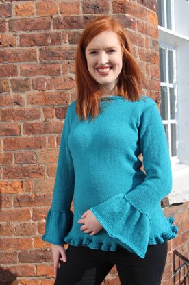This original designer knitwear pattern from Award Winning Designer Marianne Henio is for the Bluebell Sweater. Bell sleeves give it an up to date fashionable feature and the frilly edging adds to its femininity.