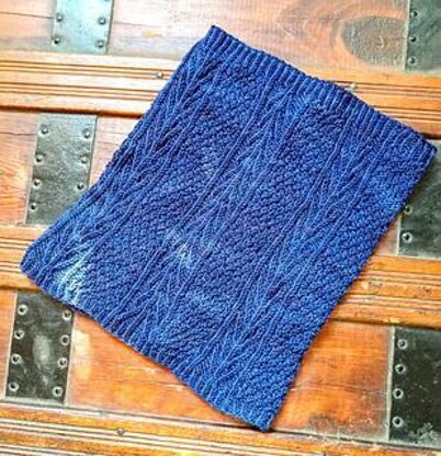 The Blueberry Ridge Cowl is knit bottom-up in the round using fingering weight yarn. It features twisted stitches and American moss stitch for a squishy, stretchy textured cowl.