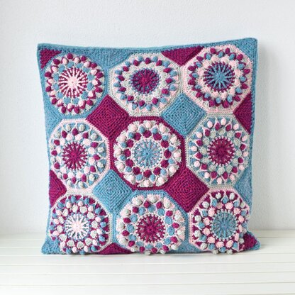 Blues in the Wind square pillow decoration consists of octagon motifs which are sewn together with joining motifs: squares, corner triangles and side triangles. A final border is added around entire joined piece.