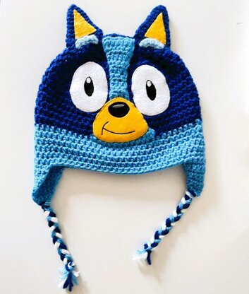 This Bluey hat is crocheted with half double crochet and single crochet stitches. It contains instructions for all ages. It also contains a video tutorial on how to make the braids for the ear flaps.