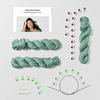The Bluprint Eastival Shawl Knitting Kit includes everything you need to complete this beginner-friendly classic shawl! This triangle shawl by Wendy Millé is a straightforward knit that features a beautiful texture pattern and the silky softness of Cloudborn Pima DK. Finished shawl measures approximately 25" by 75".This Kit Includes: Printed pattern, 3 hanks Cloudborn Pima DK (100% Pima Cotton; 100g/231yds) in Carribean, Craftsy Silverlite US 8 (5.00mm) 24" circular needles, Clover Jumbo Tapestry Needle Set (2ct), Bluprint Locking Stitch Markers (30ct) ***Note that the video instruction link included in the pamphlet is no longer valid.