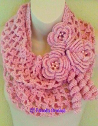 Lovely infinity scarf that can be worn long or wrapped around the neck. The pattern is chains and picots which are pretty easy and makes for an open and airy pattern. The flowers are large and in two sizes with curly cues hanging down from the flower area. Just a very nice and easy pattern that works up quickly.