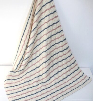 This pretty stocking stitch and garter stitch blocked blanket has slightly wavy lines of different colours running through the pattern.