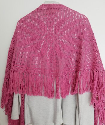 This delicate shawl design made with soft cotton yarn is inspired by traditional filet crochet technique. A very pretty lacy pattern with a stylish flower motif is easy to make: only what you need to know is how to make a chain stitch, slip stitch and double crochet.