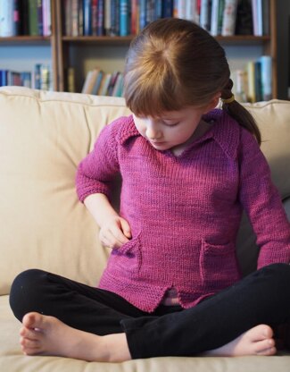 My daughter defines girl for herself, and no rules of girliness can hold her. She loves pink, plays hard, and is her own person in every way. I designed this sweater for her, with "boyish" details but in a fiery pinkish purple. Practical, with pockets; handsome, with a pointed collar and garter stitch details. Truly unisex. Knit one for your son, daughter, or nonbinary child in their favorite color.