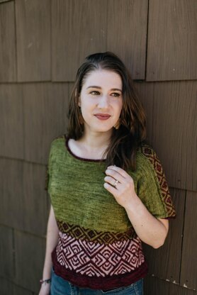 This tee is a top down, saddle shoulder garment with a boxy fit and a slightly cropped length. Instructions are given in the pattern for lengthening the body (while still having room for the colorwork chart) and adjusting the sleeve fit.