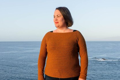 Crocheted in four pieces from the bottom up and seamed with whip stitches, it features a wide neckline shaped in the final rows for a stylish finish.