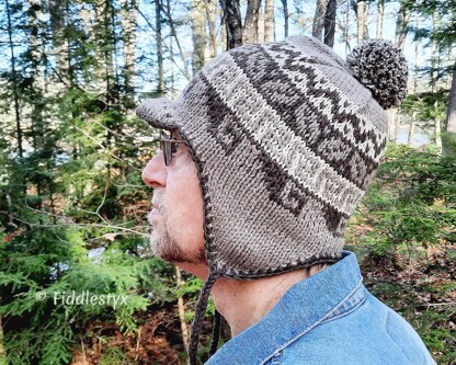 DK yarn held double makes this hat a quick knit. The earflaps are knit flat, then joined and the rest of the cap is knit in the round. The brim is attached later along with a fun pom pom.