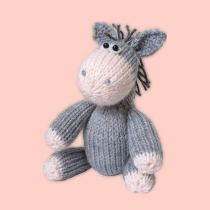 Bobbin is a silver grey donkey with a dark grey mane and tail. Designed by Amanda Berry @fluffandfuzz, the donkey is knitted in acrylic DK yarns on single pointed needles (not in the round). Donkey’s tail is an i-cord piece worked on two DPNs, but you could make a plaited yarn tail or crochet a single chain if you prefer. For confident beginners and above, other techniques used include casting on and off, knits, purls, increases and decreases, and seaming to finish.