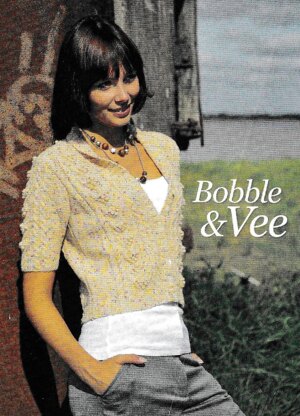 This is a pattern for a Bobble and V cable cardigan, originally published in Yarn Forward. It has short sleeves, a shawl collar, and a bobble and v cable pattern with 4 stitch cables beside it. The yarn has now been discontinued. Any yarn knitting to the tension can be used. Photos Yarn Forward.