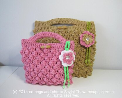 The pattern include how to make the small bag, big bag and flower decoration for the bag. They are made using single crochet stitch (UK: double crochet), half double crochet (UK: half treble crochet), double crochet (UK: treble crochet) and bobble stitch (how to make Bobble stitch is explain in the pattern).