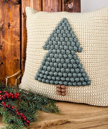 Warm up your home with this cute and cozy crochet pillow cover featuring a bobble stitch pine tree, perfect for bringing the festive spirit of Christmas or a farmhouse charm into your living space.