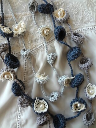 For these necklaces, I used 100% cotton sport yarn and metal 1.9 mm hook (5). Please consult hook recommendation on your yarn label. Used terms in American terminology: chain (ch), slip stitch (sl st.), single crochet (sc), single crochet 2 together (sc2tog), treble stitch (tr) Other: lace ribbon or fabric scraps, pearls or beads, sewing needle and thread. Tip: this is the perfect project to use your leftover yarn