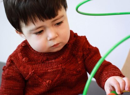 Sizes: 12m (18m, 2, 4, 6, 8, 10); finished chest circumference 19 ½ (21 ¾, 23 ¼, 24 ¾, 26 ½, 28 ¼, 29 ¾)”/50 (55 ½, 59, 63, 67 ½, 72, 75 ½) cm. Sample shown is size 2, worn with approx. 2”+ ease.