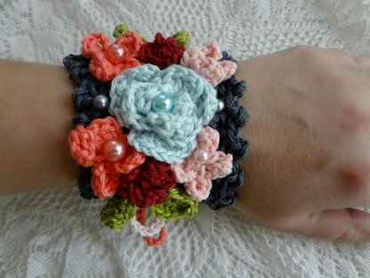 Supplies: *DK yarn of your choice for the bracelet and a 3.00 mm hook (UK11) (US 10/3) *sport yarn and a 1.9mm hook (UK 3) (US 5) for the flowers, leaves and accents * sewing thread in color matching the color of the bracelet (preferably) * sewing needle for sewing the flowers, leaves and accents on, tapestry needle for weaving ends of bracelet. Optional: glass / pearl beads, sequins. Stitches: chain (ch), skip (sk), slip stitch (sl st), single crochet (sc), half double crochet (hdc), double crochet (dc), treble (tr), picot. American terminology used. Measurements of finished bracelet: 16 cm (6.29”) across and 6 cm (2.36”) down.