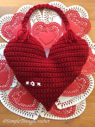 I don’t usually decorate much for any holiday other than Christmas, but this year I wanted a little something for Valentine’s Day. So I worked up this heart-shaped pillow in just a few hours, and I’m really happy with it! It’s small enough to be a quick afternoon project, but large enough to make a statement. *NOTE: The “xox” is optional, but I think it’s a cute touch. I DON'T HAVE SPECIFIC INSTRUCTIONS FOR THE EMBROIDERED LETTERING, but you basically just weave in and out with white yarn in the shape of the letters. There are lots of tutorials for that type of thing online if you want something more detailed. The heart is 10" x 10" without the handle. You will need 1 skein of Vanna's Choice in Cranberry and 1 skein in White. You won't need the whole skein of red, and you use only a tiny amount of the white for the lettering, so you can probably use any white yarn that you have on hand.