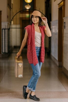 Elegant lace meets a trendy silhouette in this casual, seamless vest. The lace’s distinctive elongated pattern creates a horizontal pattern around the skirt and vertical pattern at the body.