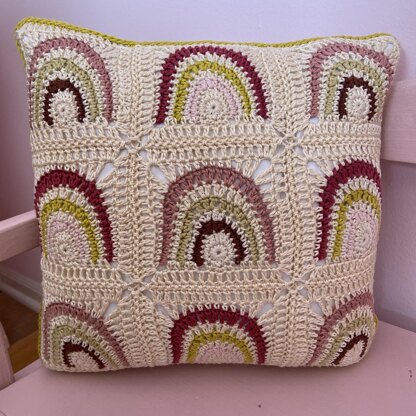 My Boho Rainbow Pillow is composed of nine granny squares. Over the summer, I made a boho rainbow garland, so I thought it would be fun to make a pillow version! Boho rainbows are a little bit different from typical rainbows as they are very tall and skinny, and they are usually composed of neutral colors with lots of pink and yellow. However, feel free to play around with different color combinations with these rainbows! I used Rowan Summerlite DK yarn: 1 powder pink, 1 summer, 1 rouge, 1 nutkin, 1 duckling, and 2 plaster. I also used 2 balls of Patons Grace in the shade natural for the cream. However, any dk weight yarn will work! You will also need a 14 by 14 in (35 by 35 cm) pillow insert, and five buttons (1.5 cm in diameter). The buttons allow the pillow to be taken on and off of the insert. The written pattern includes round by round pictures for the boho rainbow granny square, and a few more pictures to explain the steps.