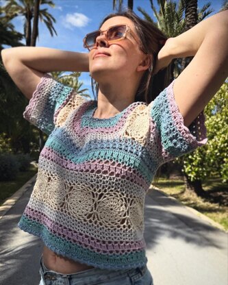 I absolutely love the color combination—it pairs beautifully with jeans, trousers, skirts, or shorts in any color. You can style it in a boho or casual way, making it a perfect piece for spring and summer. Want to customize it? You can easily extend the sleeves for a cozy sweater or add length to transform it into a stunning dress.