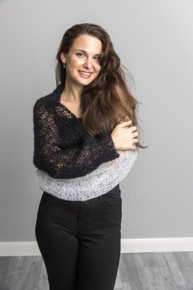 Bolero knitted in two colors in the shown picture: pale gray number 56 and black number 2. Choose your favoured color and knit this unique bolero jacket for yourself .